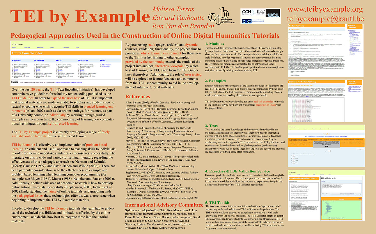 - [TBE-P001] - Terras, Melissa, Ron Van den Branden, and Edward Vanhoutte. 2007 “TEI by Example.” Poster. Digital Humanities 2007. Urbana-Champaign, Illinois (US): University of Illinois at Urbana-Champaign, 8 juni 2007. Abstract published in Digital Humanities 2007. Conference Abstracts. S. Schmidt, R. Siemens, A. Kumar, J. Unsworth (eds.). Illinois: Graduate School of Library and Information Science. 228–229. [Poster] [Abstract].