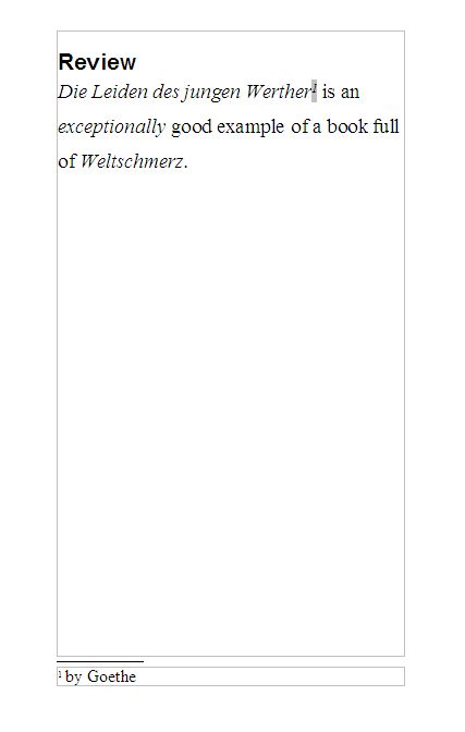 This example illustrates how the text above could be encoded in LaTeX, an open source typesetting language that can be interpreted by TeX typesetting programs for producing fixed-layout representations such as PDF. LaTeX is not an XML format, and makes use of “procedural” markup, whose meta-information (starting with the \ character) are instructions for the rendering software on the layout of the text content. As you can see, the actual text contents are preceded by a declaration of several style aspects determining how the text has to be rendered on a page. The text is divided captured as a {document}, in which all italicised words are indicated as italicised (\textit{}), without difference between the reasons for this typographic emphasis. The footnote is distinguished (\footnote{}), but there is no way of telling the computer that “Goethe” is a proper name.