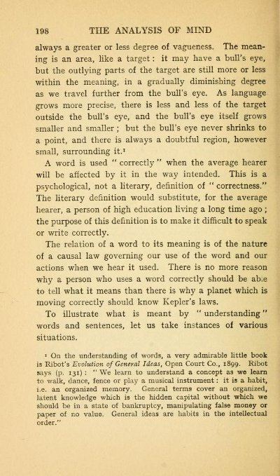 [198]always a greater or less degree of vagueness. The meaning is an area, like a target : it may have a bull's eye, but the outlying parts of the target are still more or less within the meaning, in a gradually diminishing degree as we travel further from the bull's eye. As language grows more precise, there is less and less of the target outside the bull's eye, and the bull's eye itself grows smaller and smaller; but the bull's eye never shrinks to a point, and there is always a doubtful region, however small, surrounding it.[1]